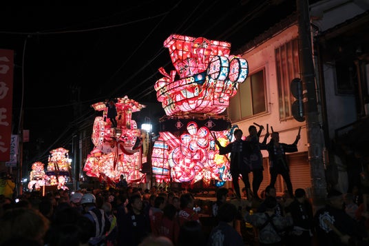 最大の見どころは、「引き合い」と呼ばれる互いの町の行燈を激しく壊し合う儀礼的なケンカ。行燈がすれ違う際に、相手の行燈に飛び乗ったり、釣物(ツリモン)を引っ張って叩き壊したり、激しく勇敢に壊し合う様子は、迫力満点です。