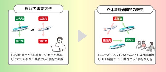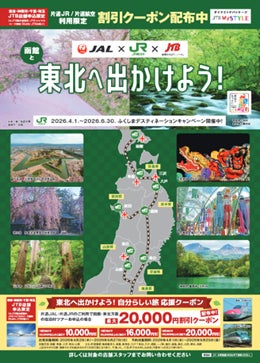 首都圏のお客さまの移動体験や周遊意向など多様なニーズを検証するため、2026年4月から9月の間、JTBの首都圏※3店舗で首都圏発~東日本エリア着の商品を「鉄道+航空」の立体観光型にカスタマイズして販売します。お客さまのニーズに応じて、往路・復路で鉄道または航空を選ぶことができます。また、商品をおトクに購入できる旅行クーポンの配布キャンペーンも実施します。適用要件など、詳細はJTBの対象店舗にてご確認ください。