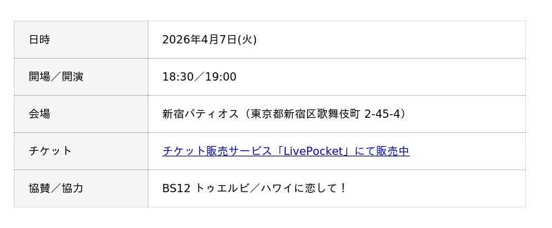 また、今年のイベントよりBS12 トゥエルビ様が協賛として、BS12 トゥエルビ様で放送中の番組「ハワイに恋して!」が協力としてイベントをご支援いただいております。