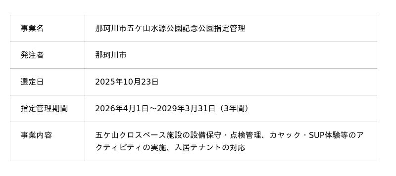 2025年10月、那珂川市が実施した「五ケ山水源公園記念公園(五ケ山クロスベース)」の指定管理者公募において、当社を代表とする共同事業体が優先交渉権者に選定されました。