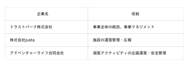 本事業は、当社を代表とする企業グループ「那珂川水源地域観光活性化共同体」が事業主体となり、当社が事業全体の統括、施設の運営管理・広報を株式会社justa、湖面アクティビティの企画運営・安全管理をアドベンチャーライフ合同会社が行います。