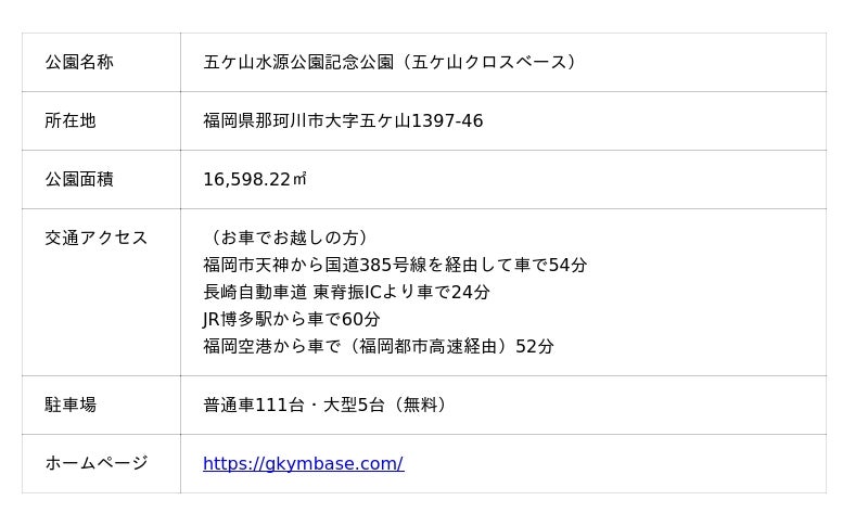 那珂川市南部に位置する五ケ山水源公園記念公園(五ケ山クロスベース)は「アーバンアウトドアの聖地」をコンセプトに、市の主要観光地域「五ケ山クロス」の拠点として、2019年3月に整備された公園です。