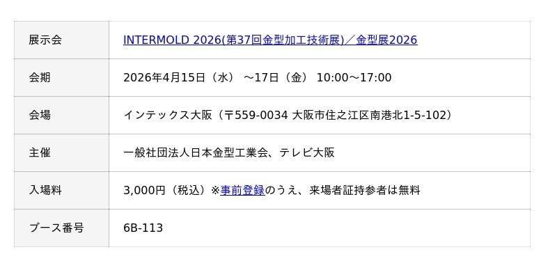 株式会社テクノア(本社:岐阜県岐阜市、代表取締役:山崎 耕治)は、4月15日~17日に インテックス大阪 で開催される「INTERMOLD 2026(第37回金型加工技術展)/金型展2026」に出展いたします。