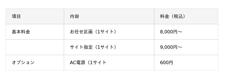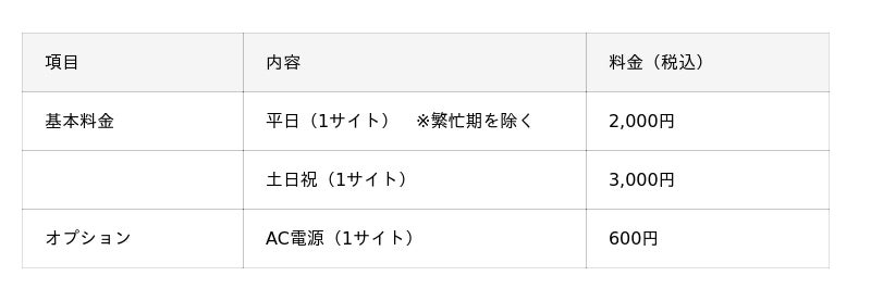 無料:各サイト横付け/共用駐車場30台