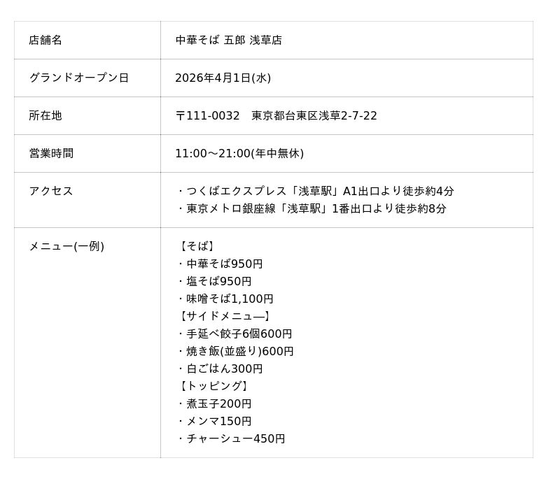 【浅草 花やしき通りで五感に響く至高の一杯を】『中華そば 五郎 浅草店』が2026年4月1日(水)グランドオープン