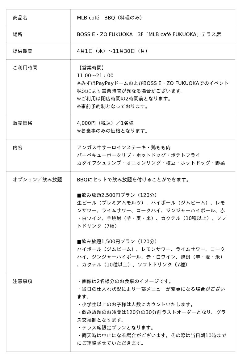 BOSS E・ZO FUKUOKA 3F「MLB cafe FUKUOKA」ではみずほPayPayドーム福岡を眺めながら楽しめるBBQプランを今年も販売いたします♪MLB cafeならではの豪快でボリューム満点のメニューをご提供☆ここでしか楽しめないBBQをお楽しみください!