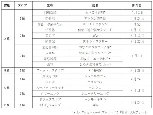 4棟(A棟・B棟・C棟・D棟)からなる施設内には全17店舗が入居。スーパーマーケット「ベルクス」やドラッグストア「マツモトキヨシ」、100円ショップ「Seria」、千葉県初出店のフィットネスクラブ「FIT-EASY」など、毎日の暮らしに密着した店舗が出店します。また、A棟1階・3階には各種診療科を集めた「メディカルモール アクロスプラザ北柏」も設置。子育て中のファミリー層からシニア層まで幅広い世代のお客さまに使いやすい店舗構成とし、ワンストップで日々のニーズを満たせる利便性の高さが特長です。