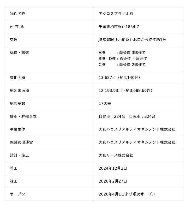 大和ハウスグループの大和ハウスリアルティマネジメント株式会社(本社:東京都千代田区、代表取締役社長:伊藤光博)は、千葉県柏市において、複合商業施設「アクロスプラザ北柏」を2026年 4月1日(水)より順次オープンします。