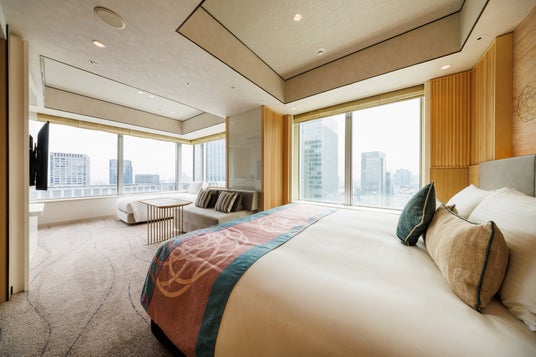 やわらかな日本の伝統色を生かした温かみのある客室は、くつろぎのひとときを演出します。窓外に広がる景色は昼夜で表情を変え、高層ビル群と電車の往来が織りなす躍動的な眺望は、思わず息を飲むほどの美しさです。