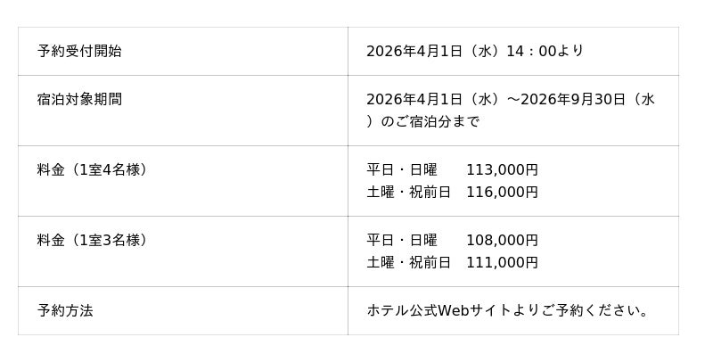 また、同日よりホテル公式Webサイトにて、宿泊予約の受付および、誕生を記念した特別料金プランの販売を開始いたします。春からゴールデンウィーク、夏休みのご旅行に、ご家族で東京駅のダイナミックな絶景を独占する特別なひとときをご提案いたします。