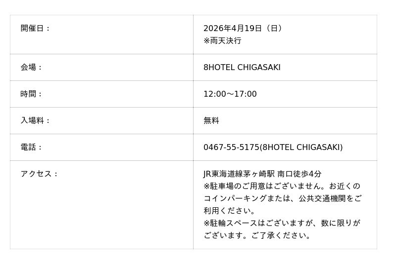 ご家族やご友人同士はもちろん、おひとりでも気軽にお立ち寄りいただけるイベントです。湘南のやわらかな春の空気の中で、人やモノ、体験との心地よい“出逢い”をお楽しみください。