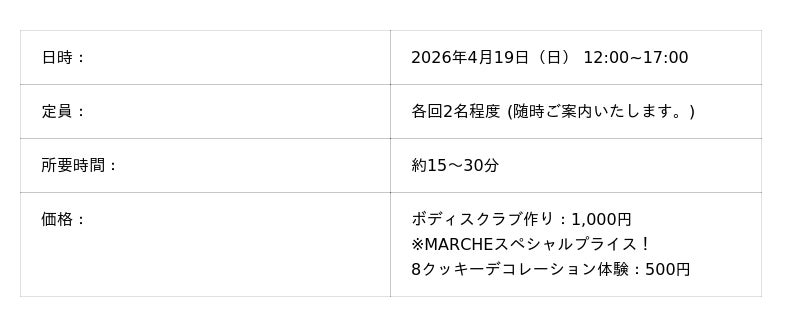 お好みの香りやテクスチャーを組み合わせ、自分だけのスクラブをお作りいただけるワークショップです。直感で選ぶ楽しさとともに、香りに包まれるひとときをお過ごしいただけます。天然素材を使用しているため、お肌にもやさしく、ご家族皆さまで安心してご使用いただけます。ワークショップ終了後にはレシピをお渡しし、ご自宅でも再現が可能。日々のバスタイムに、ささやかな変化を添えるアイテムとしてお楽しみいただけます。