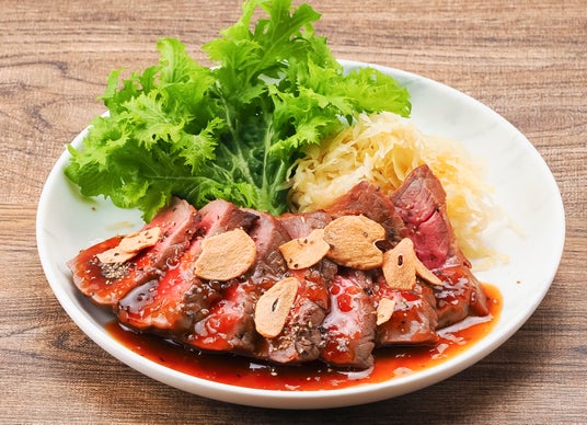 赤身のうま味が味わえる牛もも肉を香ばしく焼き上げたステーキ。
