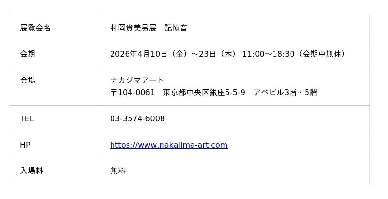 ナカジマアート開廊30周年の締めくくりとして、日本画家・村岡貴美男の個展「記憶音」を開催します。「音」と「記憶」をテーマに制作した新作を、作家自身が構成する空間で展示いたします。