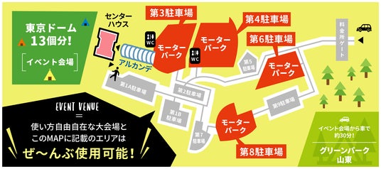 駐車場2700台、食事スペース1350席が使えて、イベントによっては20000人程度まで受入れが可能。