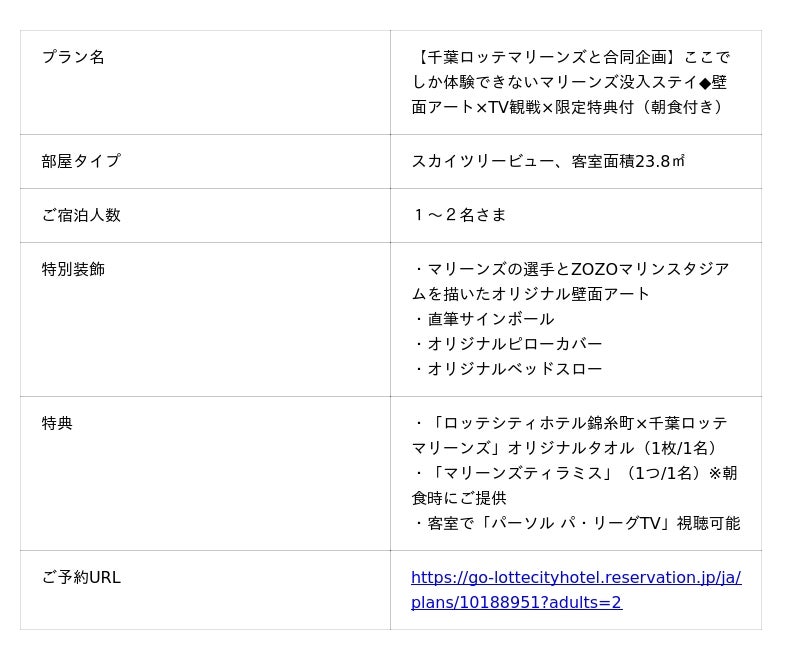 ロッテシティホテル錦⽷町(所在地:東京都墨田区錦⽷4-6-1 総支配人:福井朋也)は、千葉ロッテマリーンズとのコラボレーションルーム「マリーンズルーム」の内装をリニューアルし、5名の選手を描いたオリジナル壁面アートを新たに設えました。2026年4月3日(金)より、新装「マリーンズルーム」の予約を開始いたします。2026年は、マリーンズ公式ファンクラブ「TEAM26」が設立20周年を迎えるアニバーサリーイヤーです。当ホテルもファンの皆さまに喜んでいただけるホテルステイをご提供いたします。