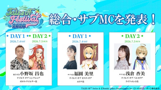 また、本イベントでは、DAY1/DAY2ともに総合司会として「テイルズ オブ シンフォニア」ゼロス・ワイルダー役の小野坂 昌也さん、サブ司会としてDAY1に「テイルズ オブ ゼスティリア」エドナ役の福圓 美里さん、DAY2に「テイルズ オブ ベルセリア」ライフィセット役の浅倉 杏美さんにご担当いただきます。