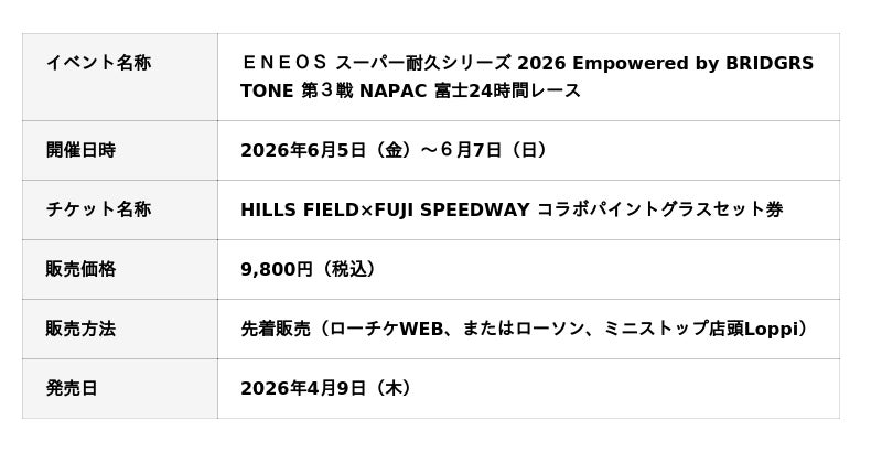 富士スピードウェイ(静岡県小山町)は、キャンプ・アウトドアブランド「HILLS FIELD」とのコラボレーションにより、人気商品のパイントグラス「富士スピードウェイ限定バージョン」(税込3,200円)を発売いたします。本商品は、2026年「富士24時間レース」開催当日にサーキット現地にて販売を開始するほか、先行して4月9日(木)より観戦券との特別セット販売を実施いたします。