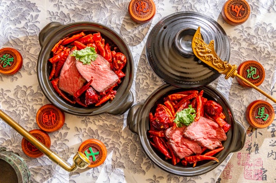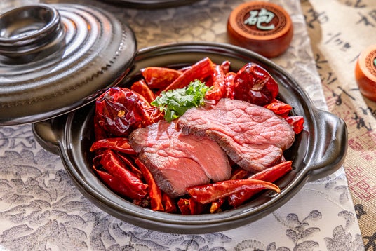低温調理した黒毛和牛の四川朝天辣椒、唐辛子、山椒のスパイシー香り炒め「赤壁の戦い」
