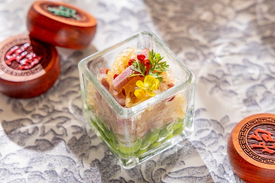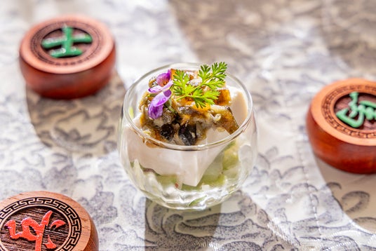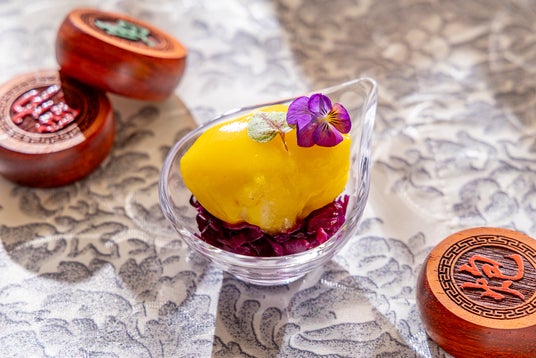 三国志に登場する絶世の美女姉妹、大喬と小喬を表現した香り高いデザート。なめらかな杏仁豆腐に、白桃のやさしい甘さとプラムの爽やかな酸味が美しく調和します。