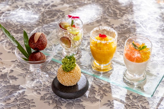 お食事の締めくくりには、4種類のデザートとグラスライチをお楽しみいただけます。三国志に登場する絶世の美女姉妹を表現した「大喬・小喬の杏仁豆腐」は、なめらかな杏仁豆腐に白桃の優しい甘さとプラムの爽やかな酸味が美しく調和します。その他にも小豆入り胡麻団子にほろ苦い抹茶クリームを添えた「孫尚香のお団子」、レモン香る2種葡萄の水晶仕立て「天命のしずく」は、レモンの爽やかな香りをまとった葡萄ジュレに2種の葡萄を閉じ込めた透明感溢れるデザート。戦乱の世、戦の行方を占う易者の水晶をイメージしました。