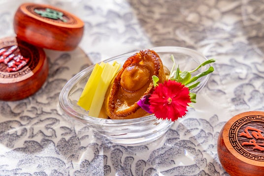敵陣から十万本の矢を“借りる”という、諸葛孔明の奇策「草船借箭」から着想。鮑を船に見立て、黄ニラともやしで矢を表現しました。オイスターソースと醤油でやわらかく煮上げた鮑は、噛むほどに磯の香りが広がります。