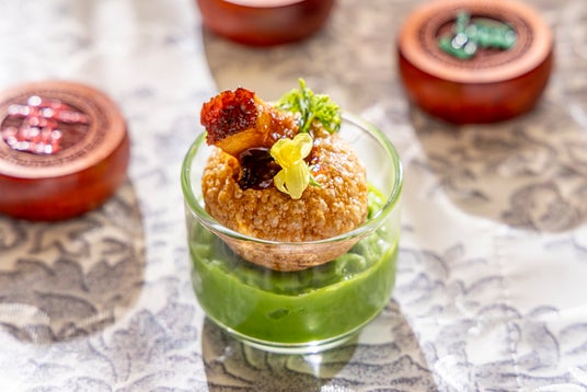 戦乱の三国志の時代、その美貌で戦局をも揺るがしたとされる貂蝉をイメージした一品。枝豆の上にクラゲと細切りにした燻製鴨を配し、バラ香る甘酸っぱいザクロソースを添えました。美を象徴するバラとザクロの余韻がお口いっぱいに広がります。