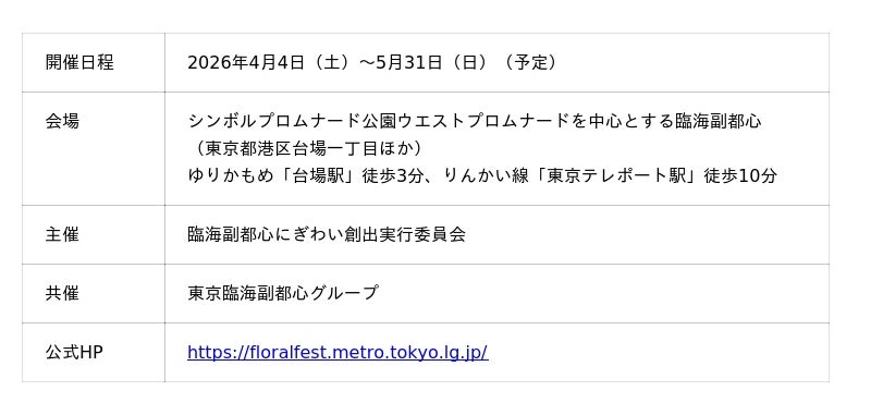 TSP太陽株式会社(本社:東京都目黒区、代表取締役社長:池澤 嘉悟)は、臨海副都心にぎわい創出実行委員会(事務局:東京都港湾局)から受託し、4月4日(土)から5月31日(日)まで(予定)の約2カ月間、春のイベント「フローラルフェスタ」を開催します。当社は本イベントにおける企画・運営・会場設営・広報を担当しています。