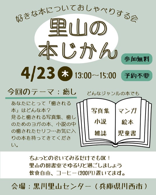 「里山の本じかん」は、お気に入りの本を持参し、参加者同士で紹介し合うイベントである。初回のテーマは「癒し」。写真集、エッセイ、小説、絵本、マンガなどジャンルを問わず、心がほっとする一冊を共有する。中学生以上を対象とし、申込み不要、入退場自由で気軽に参加できる。日時:2026年4月23日(木)13時~15時(時間内出入り自由)