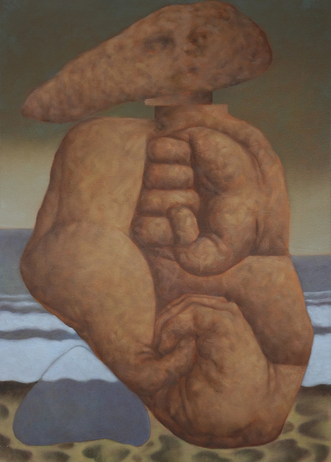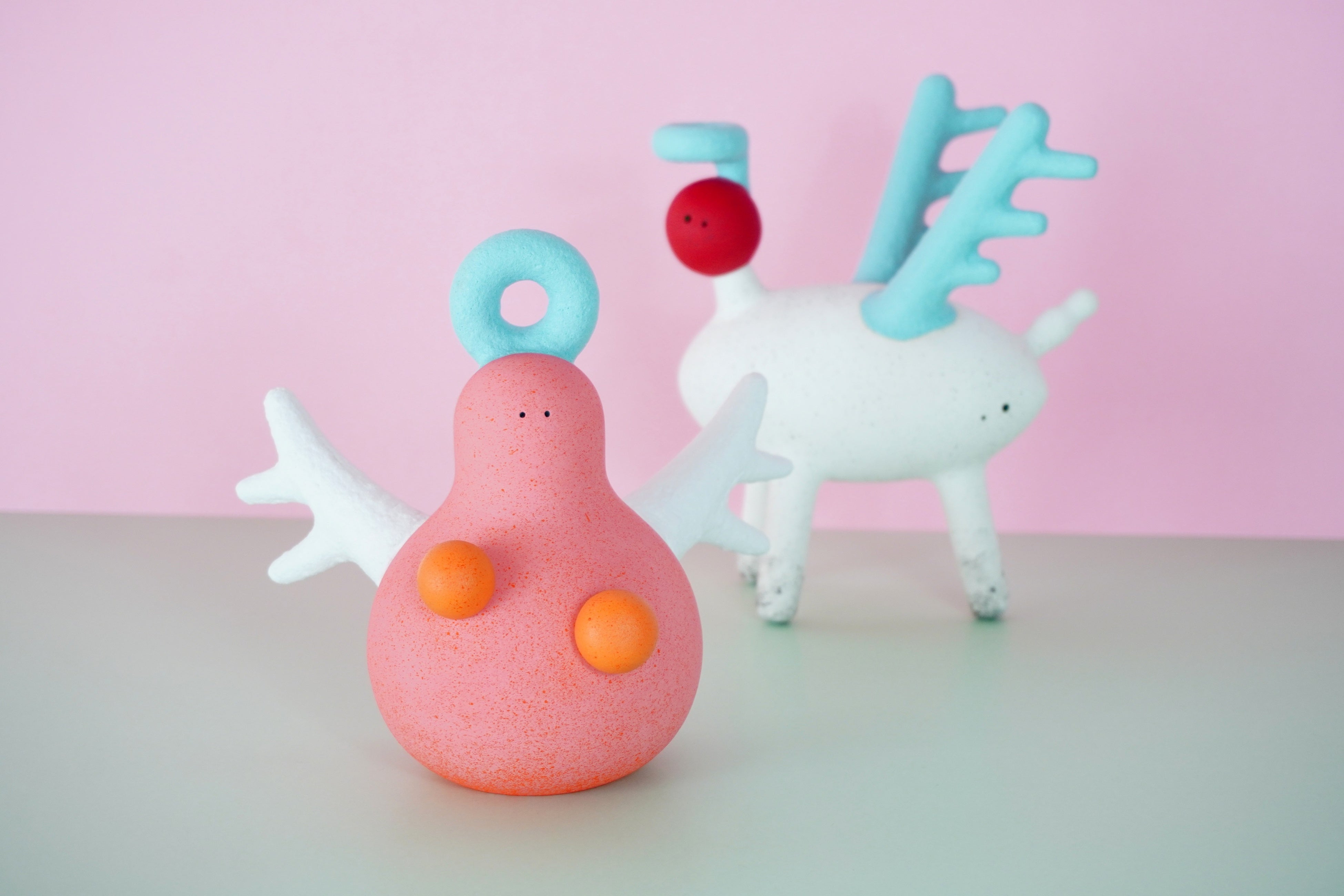経塚真代「ひとつ/もうひとつ」 石粉粘土、木粉粘土、アクリル、岩絵具