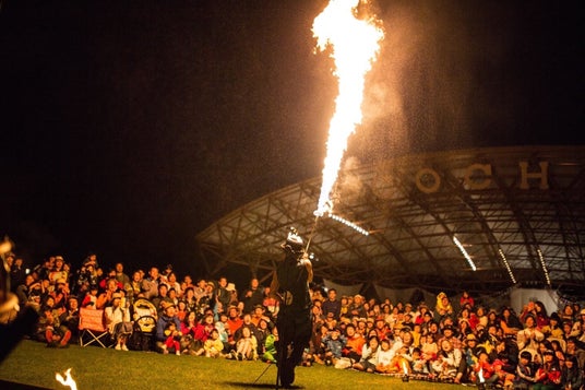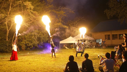 夜にはトップパフォーマーたちによる大迫力のファイヤーショーが開催されるほか、参加者同士が安全にパフォーマンスを楽しめるファイヤーエリアの開放、広大なグラウンドでのキャンプインなど、大自然とノスタルジックな木造校舎に囲まれた非日常の空間で、濃密なエンターテインメント体験を提供いたします。