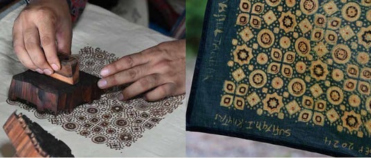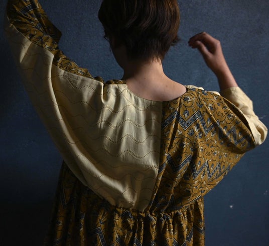 染める・刷る緻密な工程を要する「アジュラク染め」のリバーシブルドレス(39,600円) や、木版を用いる「ブロックプリント」のトートバッグ(7,480円)などを販売します 。