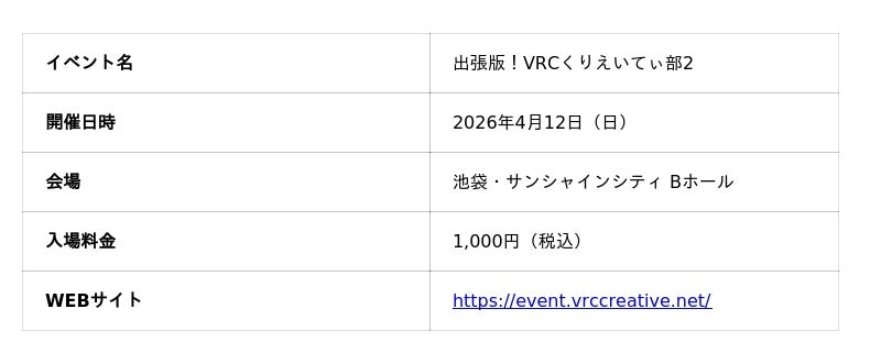 世界をリードする没入型ソーシャルプラットフォーム「VRChat」を運営するVRChat Inc.(本社:米国、CEO:Graham Gaylor)は、2026年4月12日(日)に池袋サンシャインシティで開催される「出張版!VRCくりえいてぃ部2」に参加し、ステージ登壇およびブース出展を行います。また、会場ではVRChat公式グッズの販売も行います。