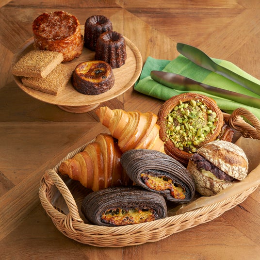 <Boulangerie S.Igarashi/ブーランジェリー エス・イガラシ>×<es feuilletage/エスタージュ>手前/手前から時計回り:パンスイス 605円、クロワッサン 454円、ピスタチオエスカルゴ 605円、あんバターサンド 832円(各1個、いずれも日本製)、奥/手前左から時計まわり:バターサブレ 313円、クイニーアマン 702円、カヌレ 389円、ファーブルトン 432円(各1個、いずれも日本製)
