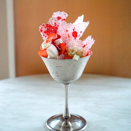 甘酸っぱいイチゴの果肉に、爽やかなバジルのグラニテを合わせた軽やかなアイスデザート。クリームとイチゴソースを重ねてバランスを取り、バリッとした飴細工が食感に華やかなアクセントを添えた一品です。