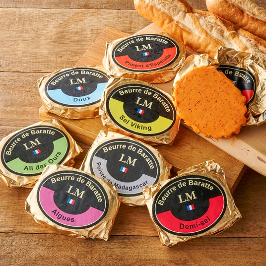 <BORDIER/ボルディエ>ブール ド バラット ドゥ(食塩不使用) 2,700円、ブール ド バラット ドゥミ セル(有塩) 2,700円、ブール ド バラット オ アルグ 3,240円、ブール ド バラット 葉にんにく 3,240円(各125g/いずれもフランス製)
