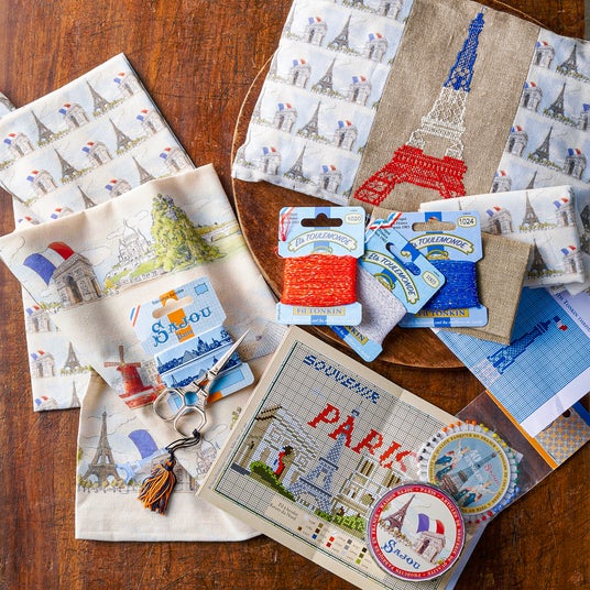 世界中の手芸愛好家が憧れる手芸店<サジュー>。輝く糸でエッフェル塔を刺繍するクッションキットや塔モチーフのはさみ、パリ柄布、カラフルなまち針など、実用性と可愛さを備えた手芸アイテムが揃います。