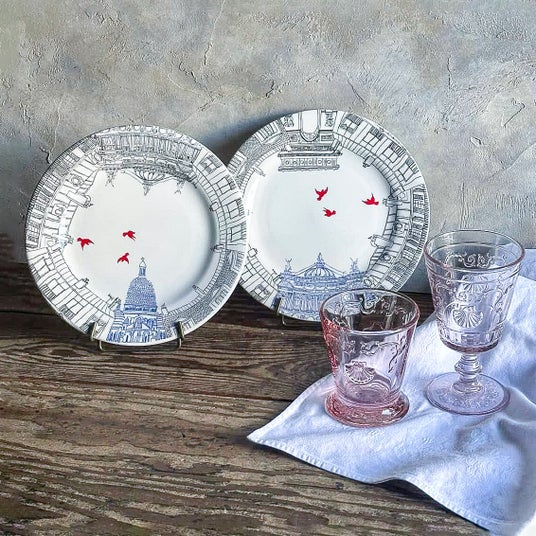 (左)オペラ座やサクレ・クール寺院など、時代を超えて人々を魅了するパリの街並みや歴史ある建造物がデザインされたプレート。(右)ヴェルサイユ宮殿にあるコキアージュ(貝殻)や花などをデザインした、ワイングラス&ゴブレット。ローズカラーは新色。
