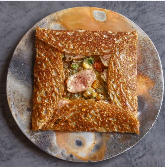 日本では珍しい地産地消の本格的なガレット専門店の「香ばしい生地と果実の酸味と鴨の旨味が溶け合う」伝統の一皿。