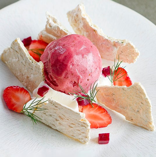 「蕎麦屋が蕎麦を打つように、サンドイッチ屋ならパンから作るのが自然」という考えのもと、自由な発想でサンドイッチやデザートを作っている<Cafe Les Gourmandises>。苺とビーツのソルベにシェーブル&クリームチーズのホイップクリーム、ディルのメレンゲ、いちごとビーツのマリネを添えたパブロヴァです。