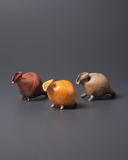 (左から)「錆朱鴨徳利」(14.1×8.2×高さ8.7cm)、「テラシッジ鴨徳利」(12.1×8.6×高さ8.2cm)、「唐津南蛮鴨徳利」(13.7×8.6×高さ8.2cm)
