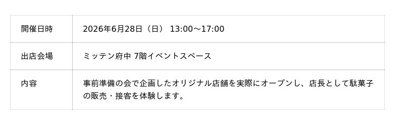 本プログラムは、後日(6月28日)に「ミッテン府中 7階イベントスペース」にて、実際に自分の駄菓子屋ブースを構えて出店する子どもたちを対象とした実践型のワークショップです。現在、限定10名にて「子ども店長」の募集を受け付けております。