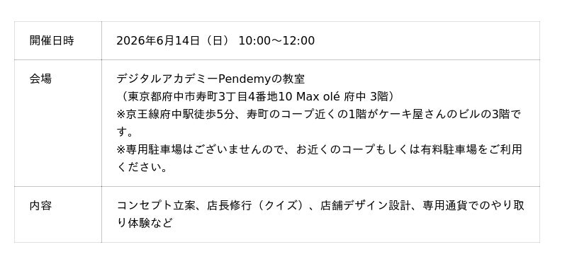 最先端のデジタル技術とものづくりを融合したSTEAM教育を企画開発する株式会社Pendemy(本社:東京都府中市、代表取締役:木村隼人)は、公共機関や学校との連携を担う「NPO法人Pendemyデジタル教育ラボ」と共同で、子どもたちが主体的に店舗運営に挑む体験イベントに向けたキックオフプログラムとして、2026年6月14日(日)に「子ども店長作戦会議(事前準備の会)」を開催いたします。