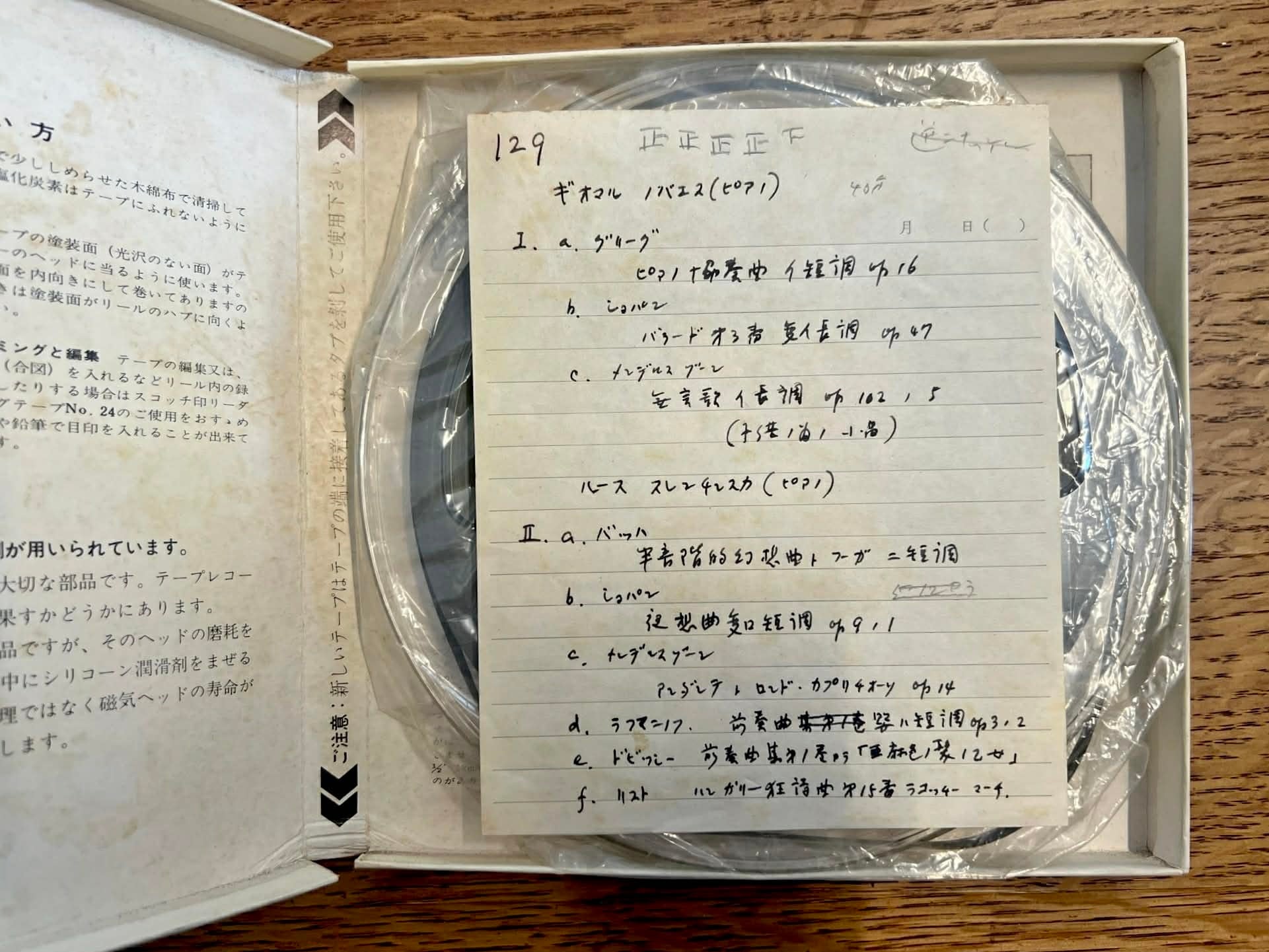 土浦亀城邸の建築の特徴的な箇所のひとつに、「ギャラリー」と呼ばれていた中2階のスペースがあります。土浦亀城はこのスペースで電蓄で音楽を聴くことがこの住宅で過ごす楽しみのひとつだったようです。土浦邸は身の回りにあった生活用品も含めて残されていたことも特徴のひとつですが、生活用品のなかにオープンリールテープと呼ばれる磁気録音テープがあります。土浦亀城はオープンリールテープにラジオ放送から西洋音楽を録音しており、約150本が現存しています。ほぼすべてのオープンリールテープのケースの背表紙に曲名や演奏者名を、ケース内に音源について細かな情報を記載したメモを残しています。