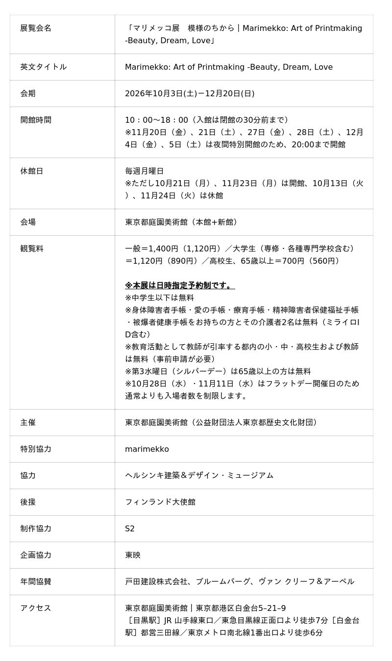フィンランドを代表するデザインハウス、マリメッコ。1951年の創業以来、世に送りだされたプリント・デザインは3500種類以上にのぼります。鮮やかな色彩と大胆な模様によって、私たちの生活を豊かに彩るデザインは、世代や国境を超えて広く支持されてきました。本展では、様々な年代の貴重なドレスやファブリック、制作過程のイメージなど、多彩な資料を通してマリメッコの創造の美学を明らかにします。