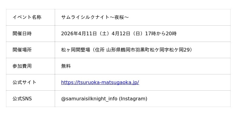 史跡松ヶ岡開墾場管理運営協議会(山形県鶴岡市、代表:堀誠)が管理する国指定史跡「松ケ岡開墾場」は、2026年4月11日(土)・4月12日(日)の2日間、場内の樹齢100年を超える桜並木を生演奏と光で彩るスペシャルライトアップイベント「サムライシルクナイト~夜桜~」を開催いたします。