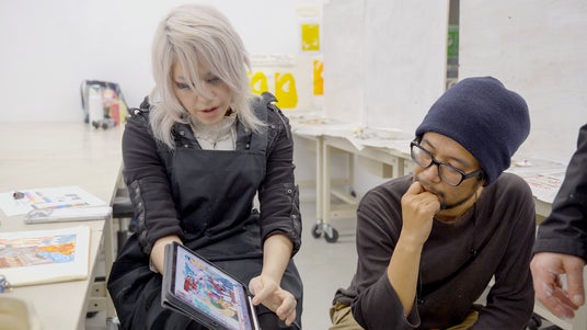 メンターであるMAHAROが学生アーティストLyric Hebertのラフ案をレビューする様子 (Photo: TUJ)
