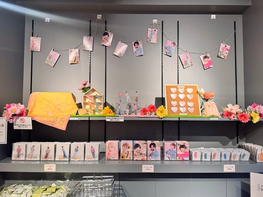 さらに、カフェオリジナルアイテムが並ぶエリアには、ここでしか手に入らない春らしいデザインのハート缶バッジやバンダナ、蓋付きマグカップなどの商品を実際に手に取ってご覧いただくことができます。是非この機会にご確認ください!