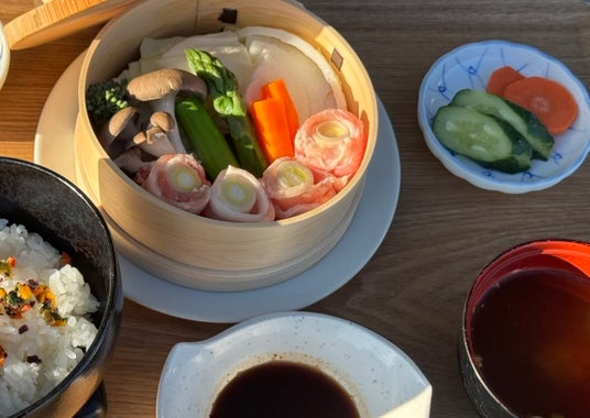 (木曽ヒノキの蒸篭で地場野菜と信州豚を蒸し上げた一品)