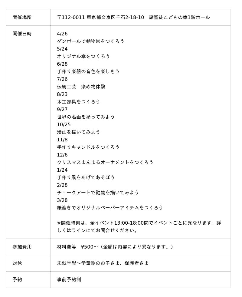 本イベントは、「つくってみよう!あそんでみよう!たのしいことをみつけよう!」をテーマにした、心のおもむくままにアートを楽しめる工作ワークショップです 。今年度は、一人ひとりの感じ方や表現のスタイルを何よりも大切に、年齢や発達、障がいの有無などに拘わらず、自分のペースで「好き」を見つけられる時間をお届けします 。
